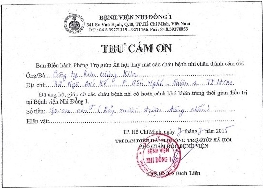 Ngày 7/7/2015 vừa qua, đại diện Cty KITA đã đến thăm và đóng góp số tiền 70.000.000 cho Phòng Trợ giúp Xã hội của BỆNH VIỆN NHI ĐỒNG 1 để giúp đỡ và ủng hộ cho các bệnh nhi có hoàn cảnh khó khăn trong thời gian điều trị.