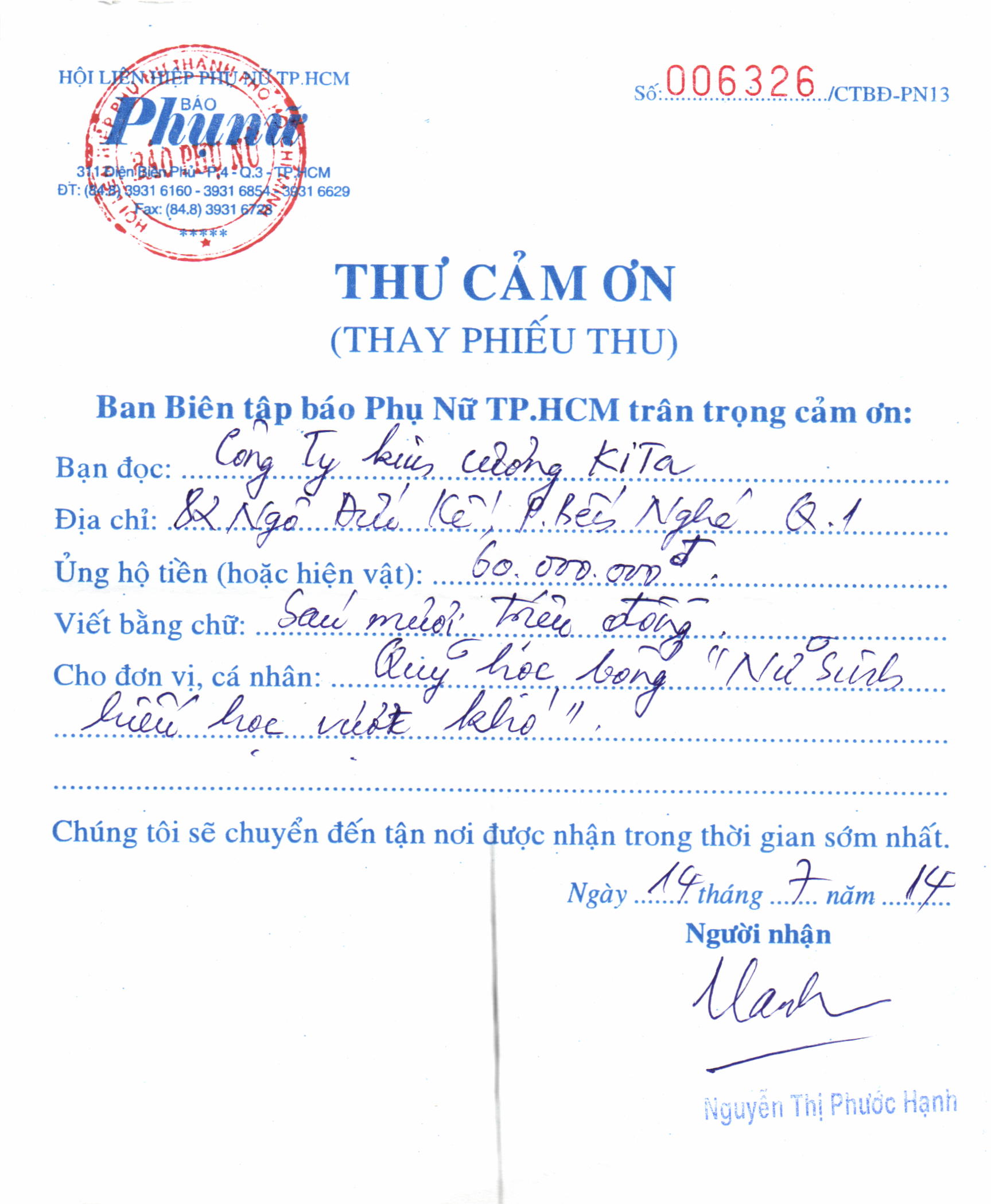Với chương trình KITA KHUYẾN HỌC T7/2014,Công ty Kim Cương KITA đã cùng quý khách hàng ủng hộ số tiền 60 triệu đồng